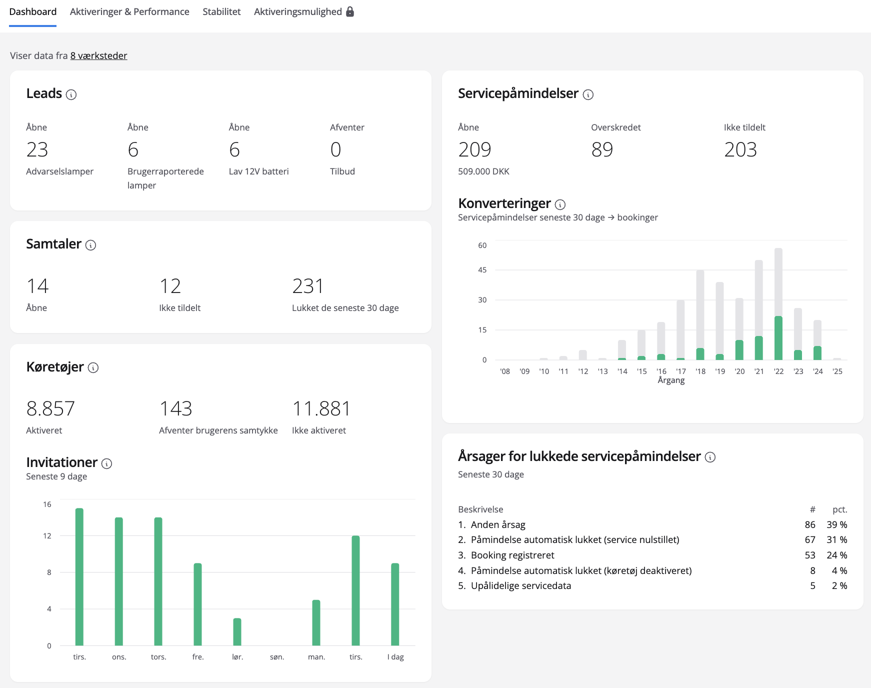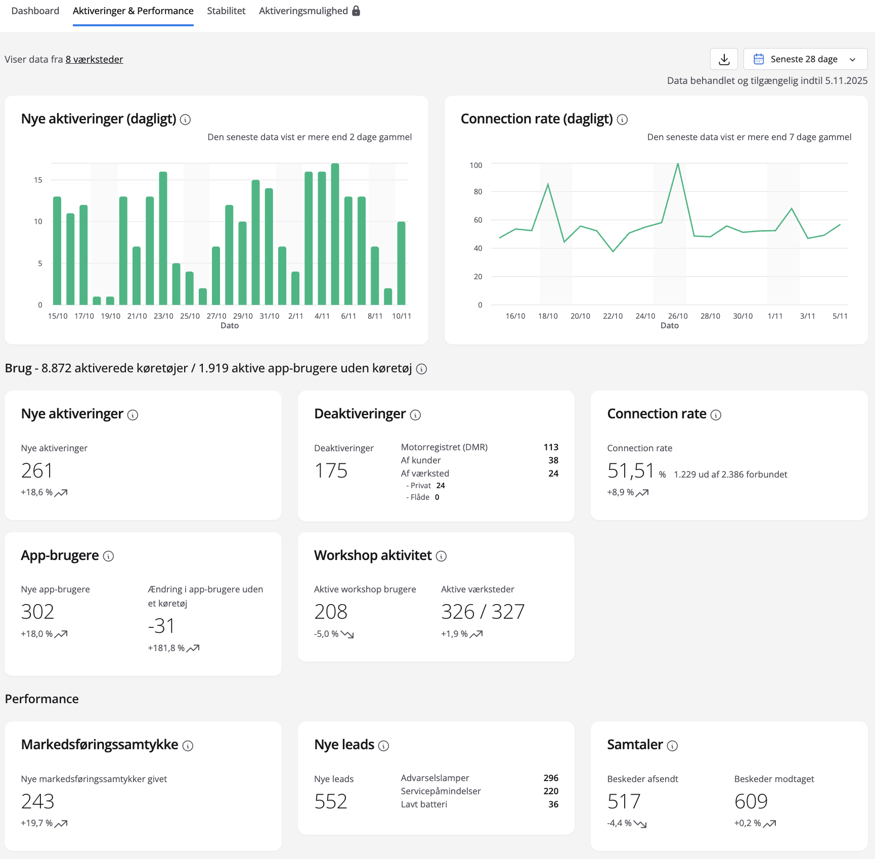 Som importør har du brug for et værktøj, som giver dig et klart overblik over hvor godt dine værksteder præsterer, samt rækkevidden på din connectivity. På værkstederne kan det være nyttigt at følge diverse trends på de leads, der er blevet oprettet, og sammenligne dem over perioder af tid. Med Aktiveringer og Præstationer dashboardet er alt dette muligt!