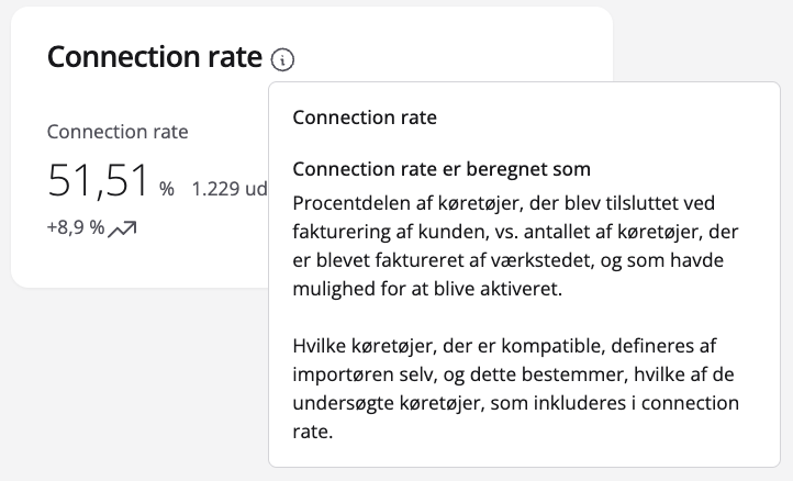 Connection rate er den procentdel af kompatible køretøjer, som forlader værkstedet med en aktiv forbindelse, sammenlignet med de samlede gennemgange. Gennemgang refererer til det totale antal biler, der har været igennem værkstedet i den valgte periode.