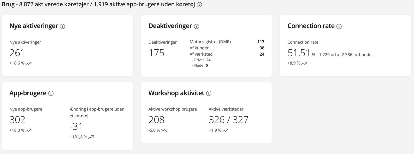 Disse tal er statiske, hvilket betyder, at uanset hvilken periode du vælger, så vil tallene altid reflektere de nuværende antal aktive køretøjer og aktive appbrugerer uden en forbundet bil for de værksteder, du har valgt.