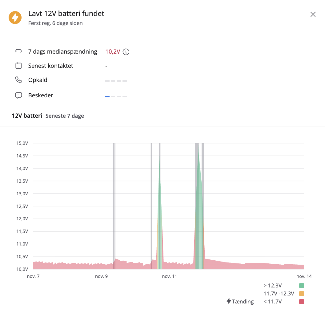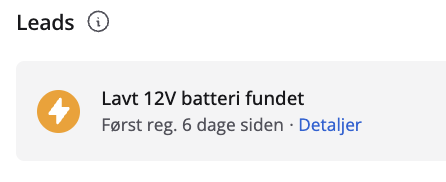Således ser lave batterispændingsleads ud i oversigten over alle aktive leads, samt på bildetaljesiden. Det er muligt at klikke på batteriikonet og se en graf over batteriets spænding over de seneste 7 dage:
