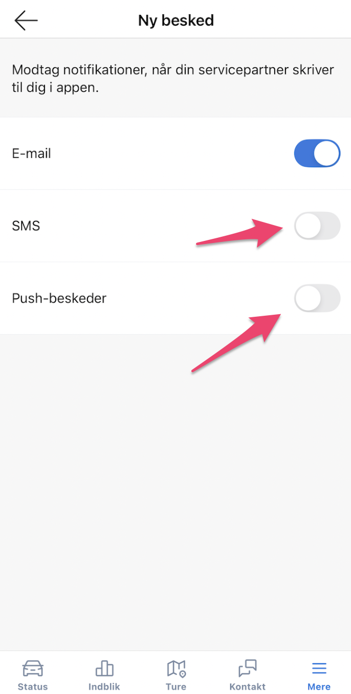Tryk på fx “Ny besked” (hvis kunden ikke vil have SMSer, når der kommer nye beskeder i chatten fra værkstedet)