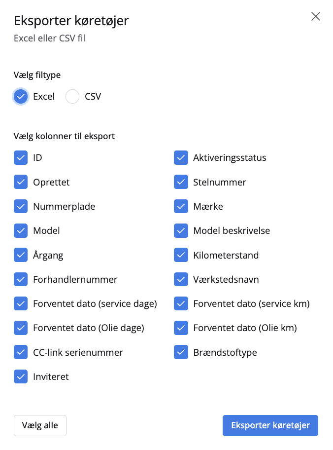 Gennem Connected Workshop kan du bruge eksportfunktionen til at oprette en liste over de køretøjer, der er tilknyttet dit værksted. Du kan sortere på en række datapunkter, og når du trykker på eksport, vil listen over køretøjer blive sendt til den e-mailadresse, der er knyttet til din Connected Workshop-konto. Du kan vælge at eksportere filen som en CVS-fil eller som en Excel-fil.