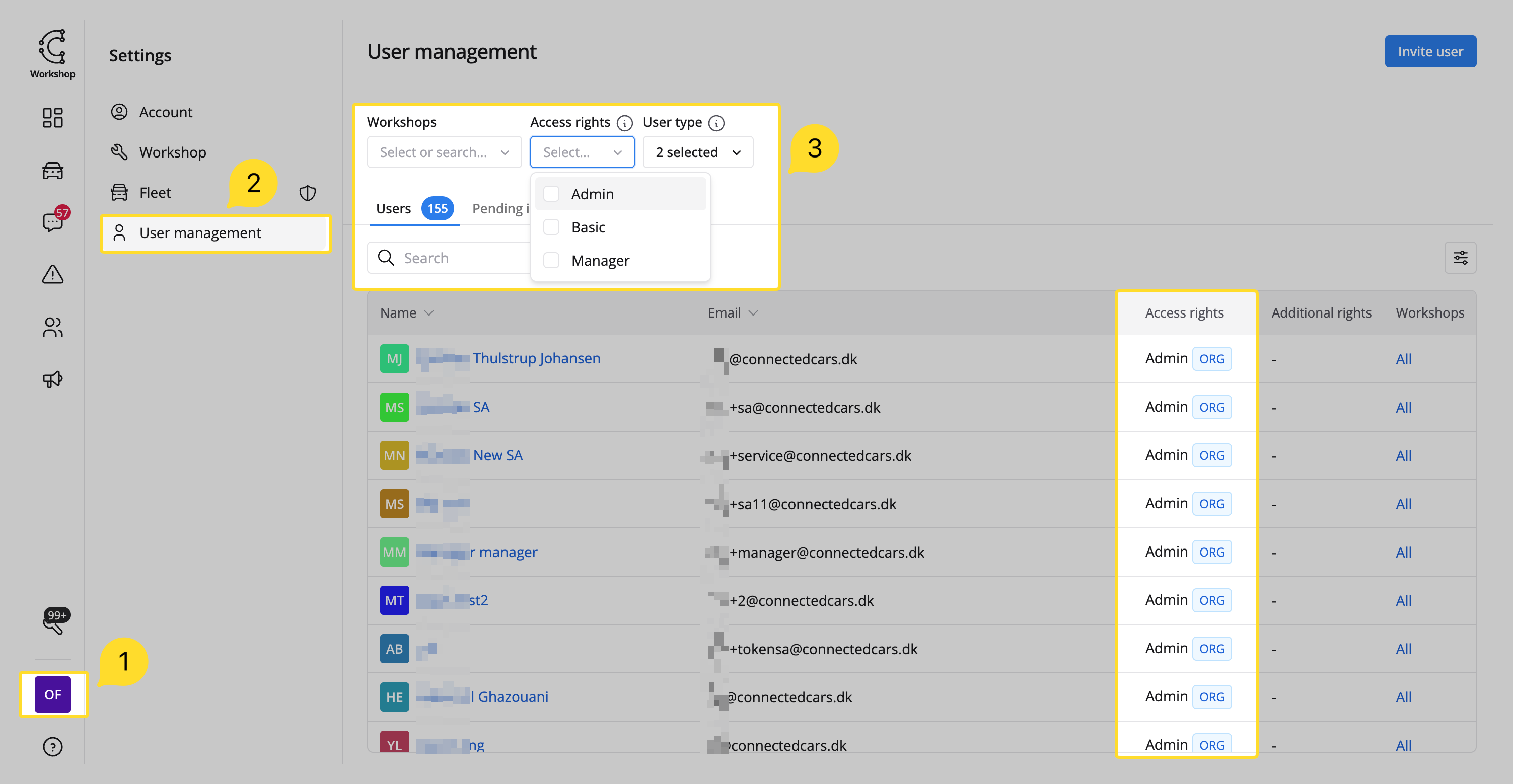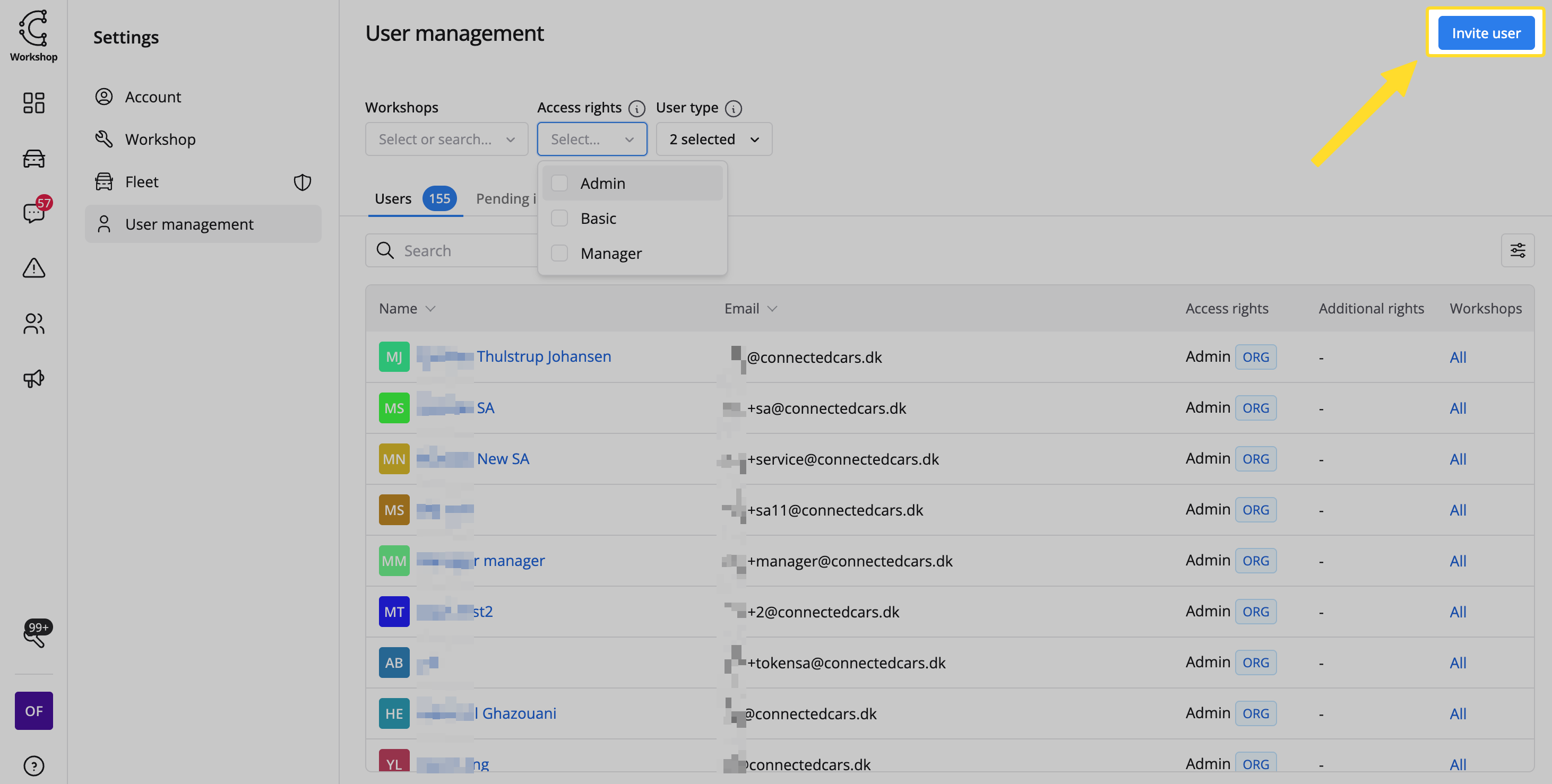 Filtrer listen efter værkstedsadgang, brugerrettigheder eller brugertype: