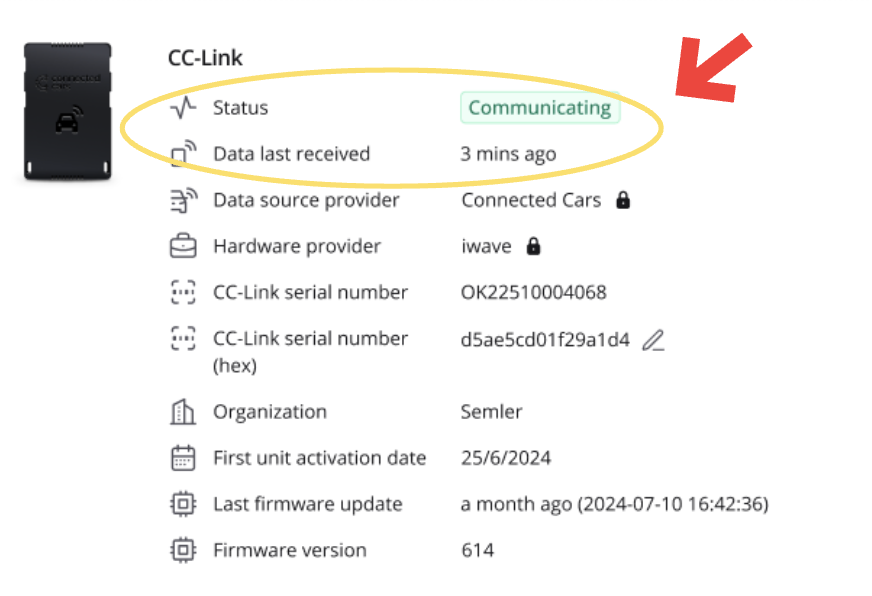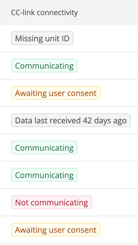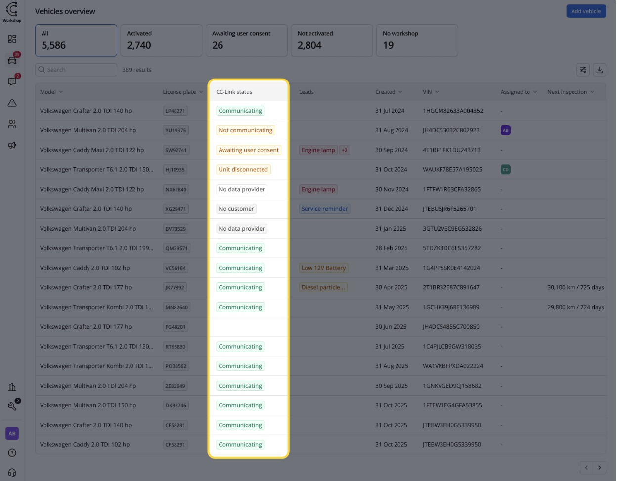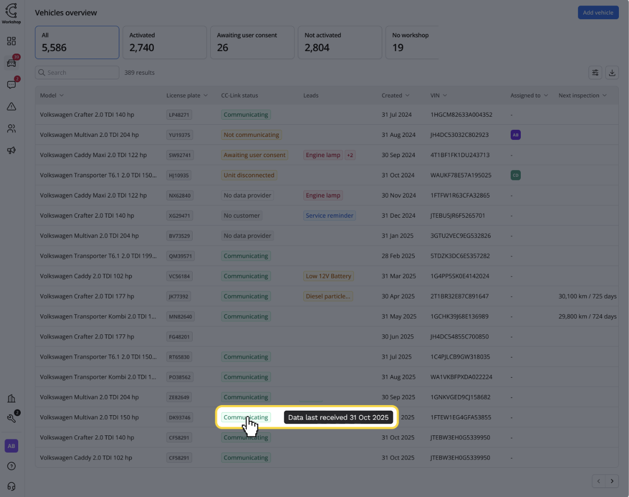 In the Vehicle Overview, you’ll now see a separate column for connection. CC-Link Connectivity now shows clear connection status using colour-coded badges and labels, making it easy to see if a vehicle needs action.